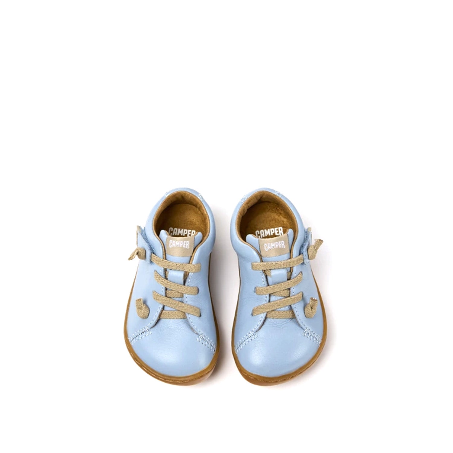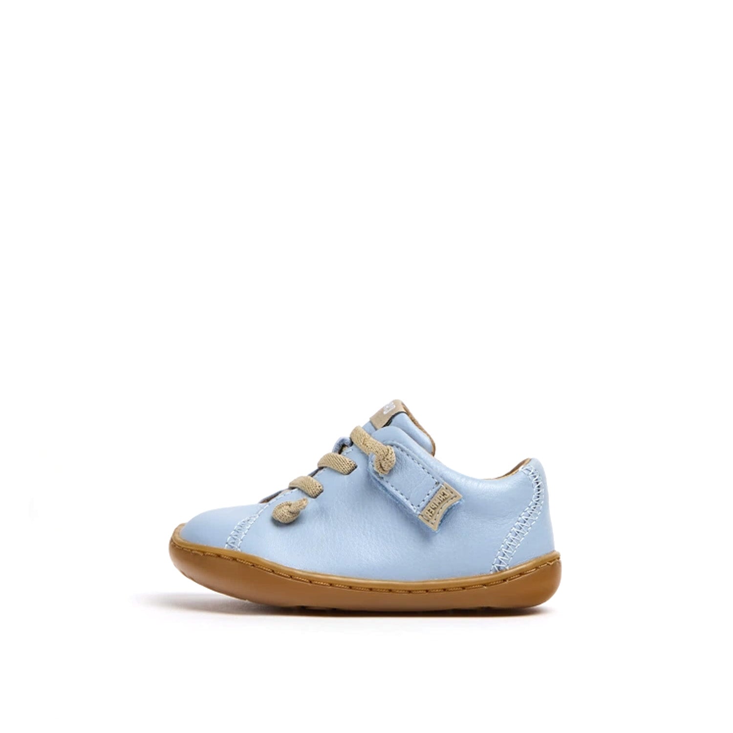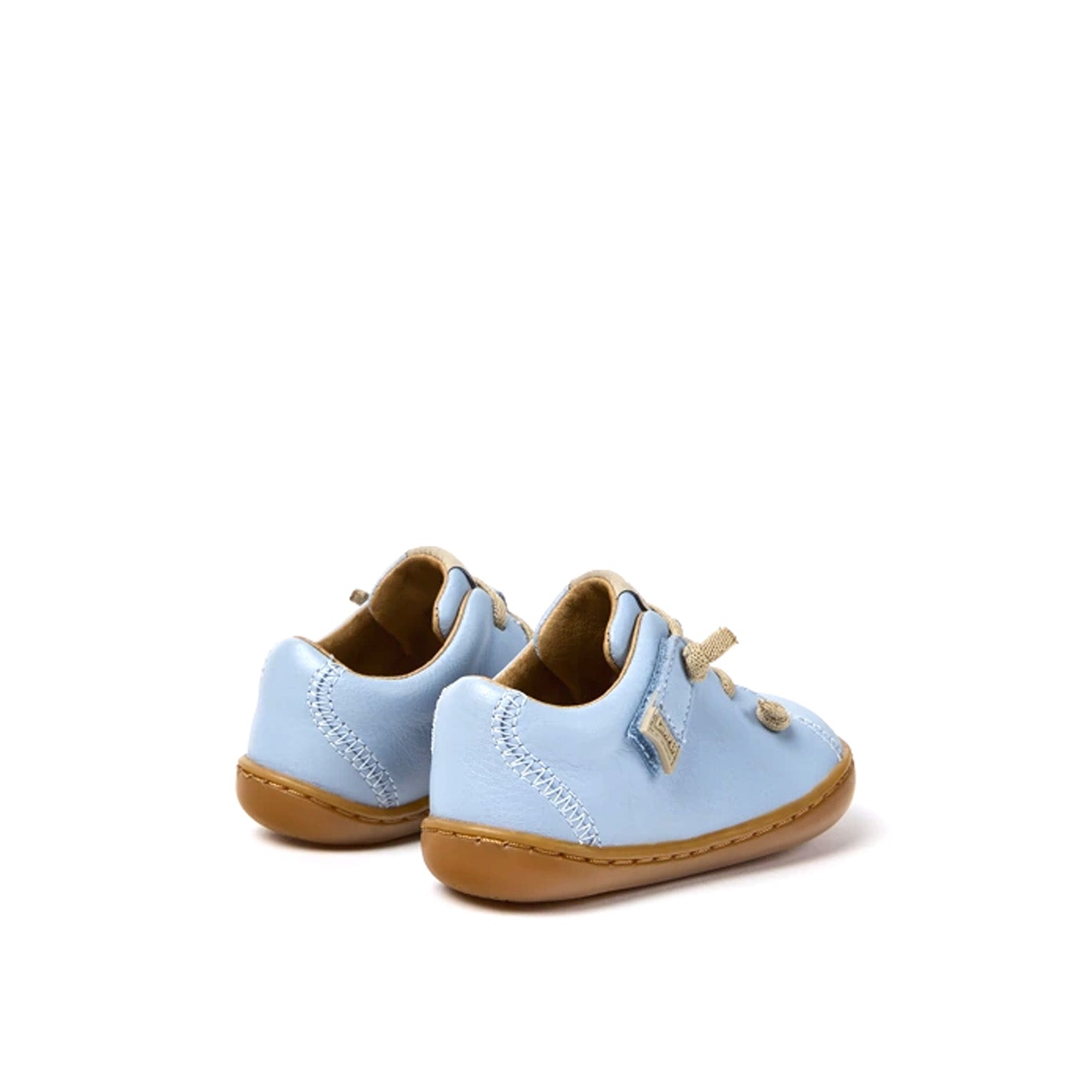 Scarpa per bambini in pelle azzurra con suola in gomma cucita (20% riciclata), lacci elasticizzati in PET riciclato e sistema di chiusura in velcro. La linea First Walkers è caratterizzata da modelli resistenti e al contempo morbidi, ideali per i bimbi che muovono i primi passi. Scopri la nostra collezione di confortevoli scarpe primi passi, realizzate per offrire supporto ai piccoli pronti per le prime avventure. Un’icona Camper che si evolve a ogni stagione. Peu è un simbolo di semplicità pratica, ispirata alla sensazione di camminare a piedi nudi. Presenta una cucitura a 360° e la costruzione Strobel, che garantiscono flessibilità e durevolezza impareggiabili in qualsiasi condizione.
